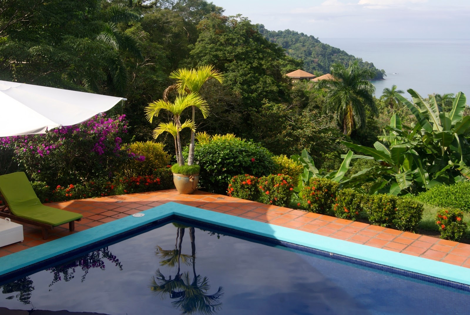 The house sits atop a small mountain, overlooking the splendid views of the warm Pacific and many beaches of Quepos and Manuel Antonio. With four master bedrooms on the ground floor and 2 below, the house is like a mini hotel that you have all to yourself. The setting of the house is focused on nature, so the dining room sits outside alongside the living room (though there is another one inside for rainy days) and the pool is a few steps down amongst the palm, chocolate, and mango trees.